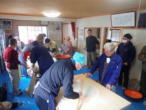 今日は会議の後そば打ち体験会に23名が参加し、そば打ち名人の指導のもと、皆でそば打ち体験をした。名人の手ほどきを受け、真剣な表情でそば打ちを楽しんでいた。その後早速打ったそばを実食した。自分たちが打ったそばは格別に美味い。「次はもっと上手にそばを打つ」と目標を掲げて、今年もそば種まきから頑張りましょうと言って解散した。