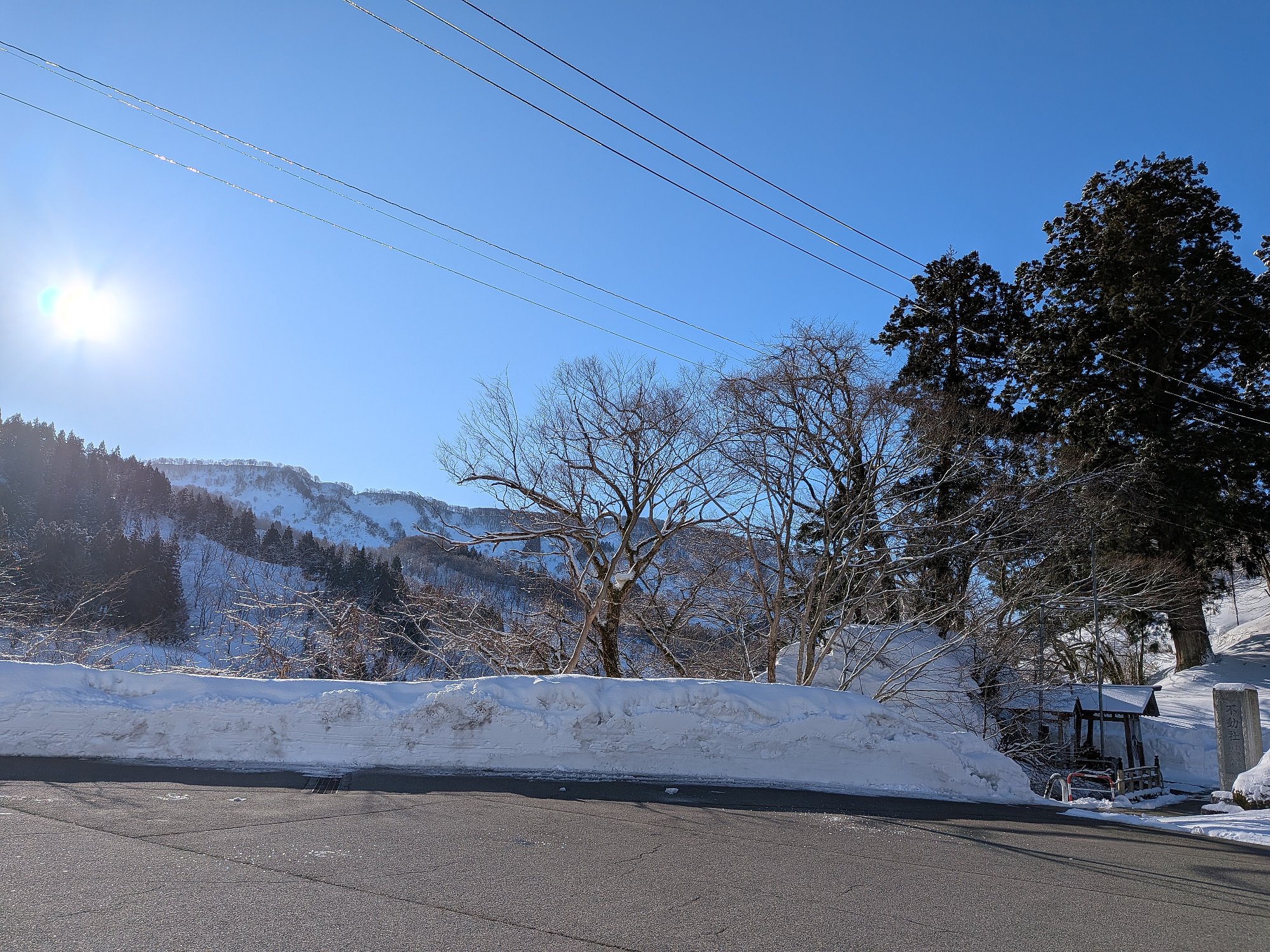 上の写真 2026/01/10 8:50ころ 社務所前から北側フキロ方向を撮影 前夜まで雪が降りこの朝は快晴、雪の白さと空の青色のコントラストが大好き。ただ画面下側に撮影者の影が写ってしまった。