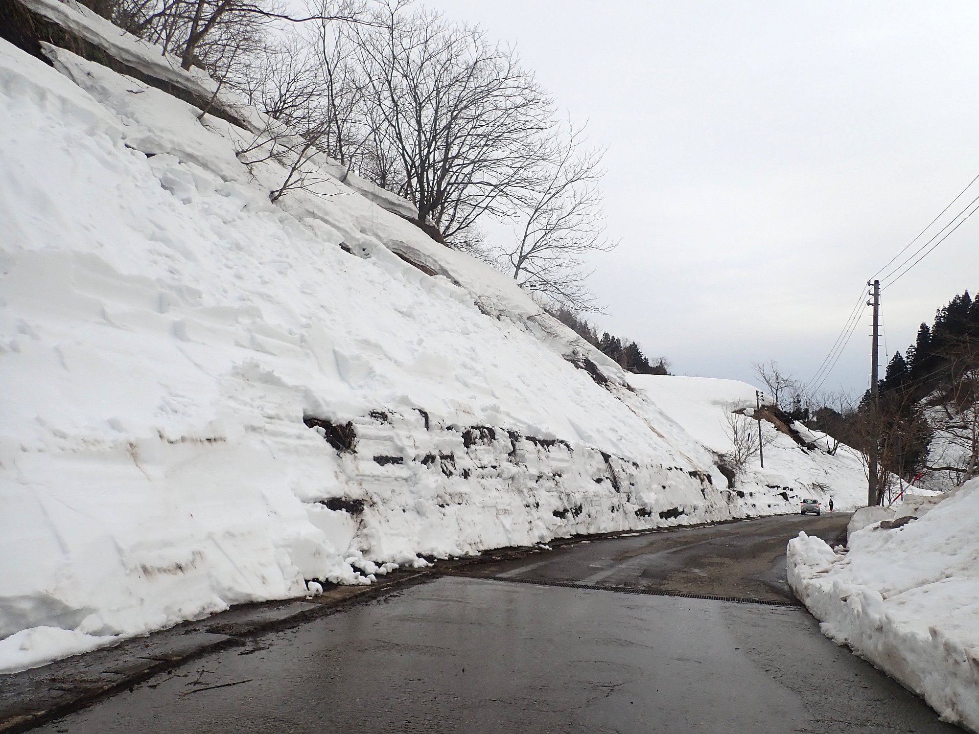 追記 2026/03/06 夕方、雪庇落とし作業が終わったみたいです。道路幅が広がったようになり、車で通る際は安心感があります。ただし、重機で届かなかった上部にはまだ雪が残っています。雪崩はいつどこで発生するかもしれません。竹之高地に来る際、雪がなくなる4月下旬までは十分注意して通行してください。
